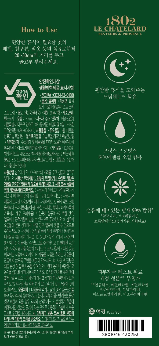 | 품목 및 제품명 | 탈취제 / 르샤트라 아로마 필로우미스트 포레스트 드림 | 용도(표백제의 경우 계열을 함께표시) 및 제형 | 일반용(물체용) / 분무기형 |