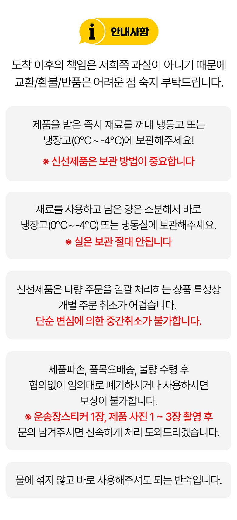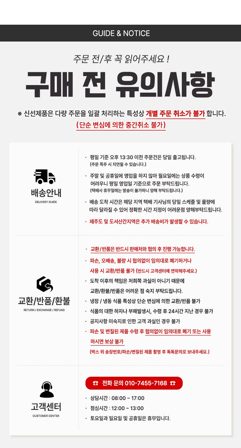 | 배송방법 | 신선/냉장/냉동 | 배송비 | 무료배송 · 도서산간 추가 배송비 - 제주 지역: 5,000원 - 도서산간 지역: 8,000원 |