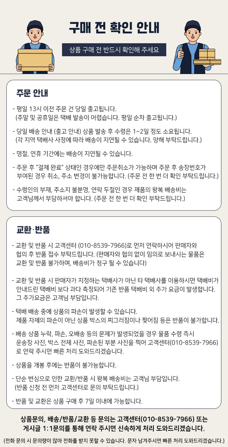 - ㆍ모니터 해상도의 차이로 인해 색상이나 이미지가 실제와 달라, 고객이 단순 변심으로 교환/반품을 무료로 요청하는 경우