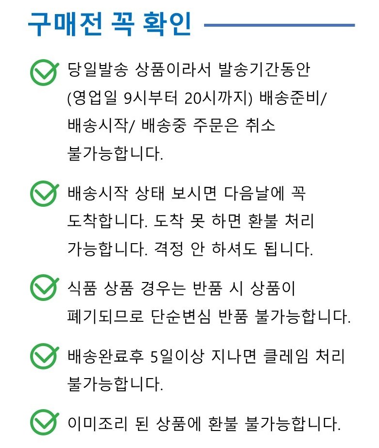 - ㆍ교환/반품에 관한 일반적인 사항은 판매자가 제시사항보다 관계법령이 우선합니다.