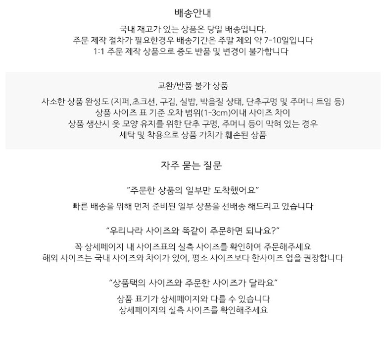 | 교환/반품 비용 (왕복비용) | 6,000원 - 단, 고객 변심의 경우에만 발생 - 도서산간 및 일부 지역 추가비용 발생 |