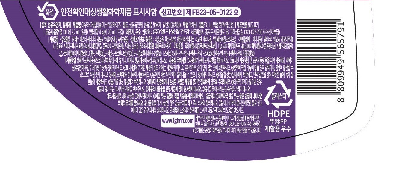 | 품목 및 제품명 | 섬유유연제, 탈취제 / 아우라 퍼퓸캡슐 미스틱문라이즈 | 용도(표백제의 경우 계열을 함께표시) 및 제형 | 섬유유연제 : 섬유용, 탈취제 : 일반용(물체용) / 액체형 |