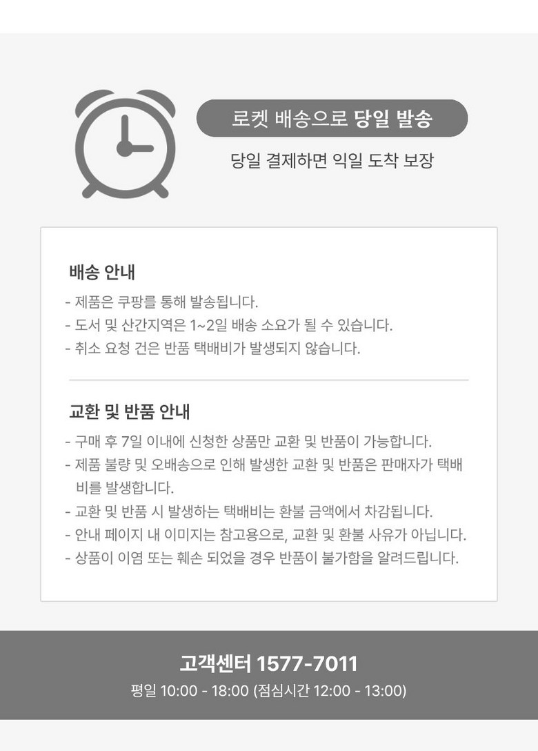 | 소비자상담 및 교환반품 문의 | 쿠팡고객센터 1577-7011 배송 및 환불/교환에 대한 문의는 마이쿠팡-고객센터 내 상담하기를 이용해주세요. | ||
