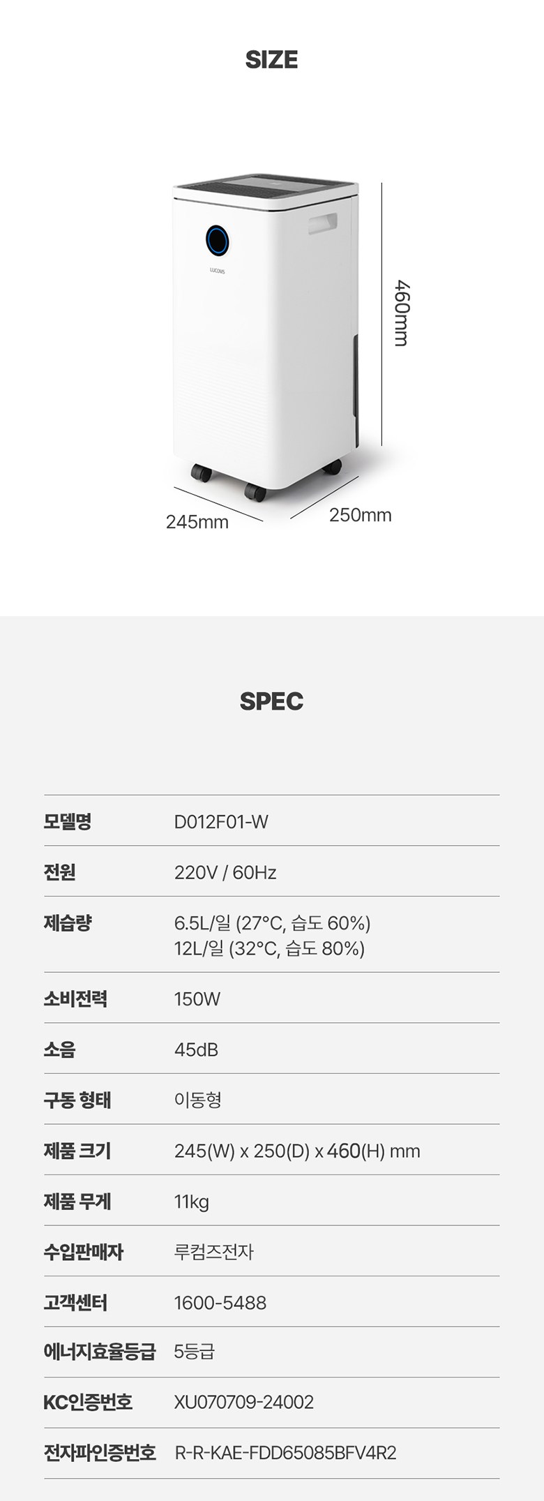 | 품명 및 모델명 | 제습기 / D012F01-W | KC 인증정보 | XU070709-24002, R-R-KAE-FDD65085BFV4R2 |