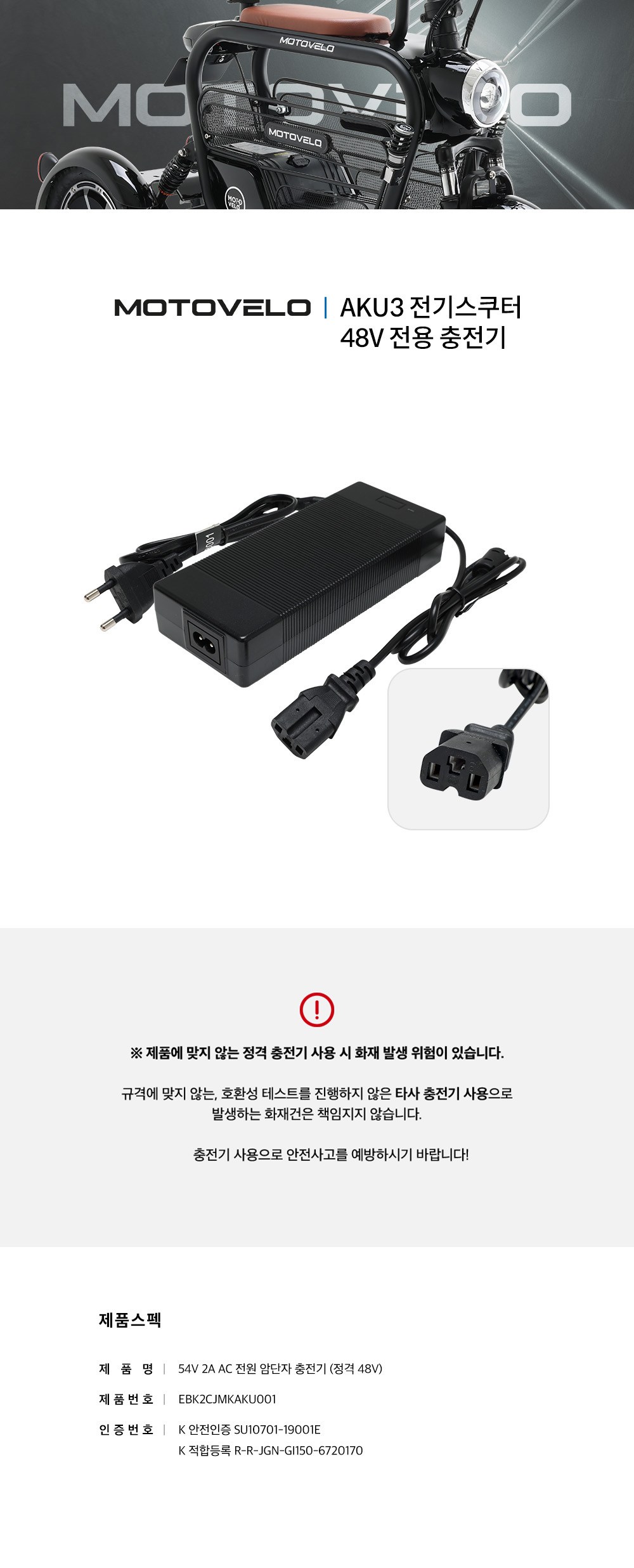 | 품명 및 모델명 | 모토벨로 AKU3 전동스쿠터 54V 2A AC 전원 암단자 충전기 / GI150-6720170 | KC 인증정보 | SU10701-19001E,R-R-JGN-GI150-6720170 |