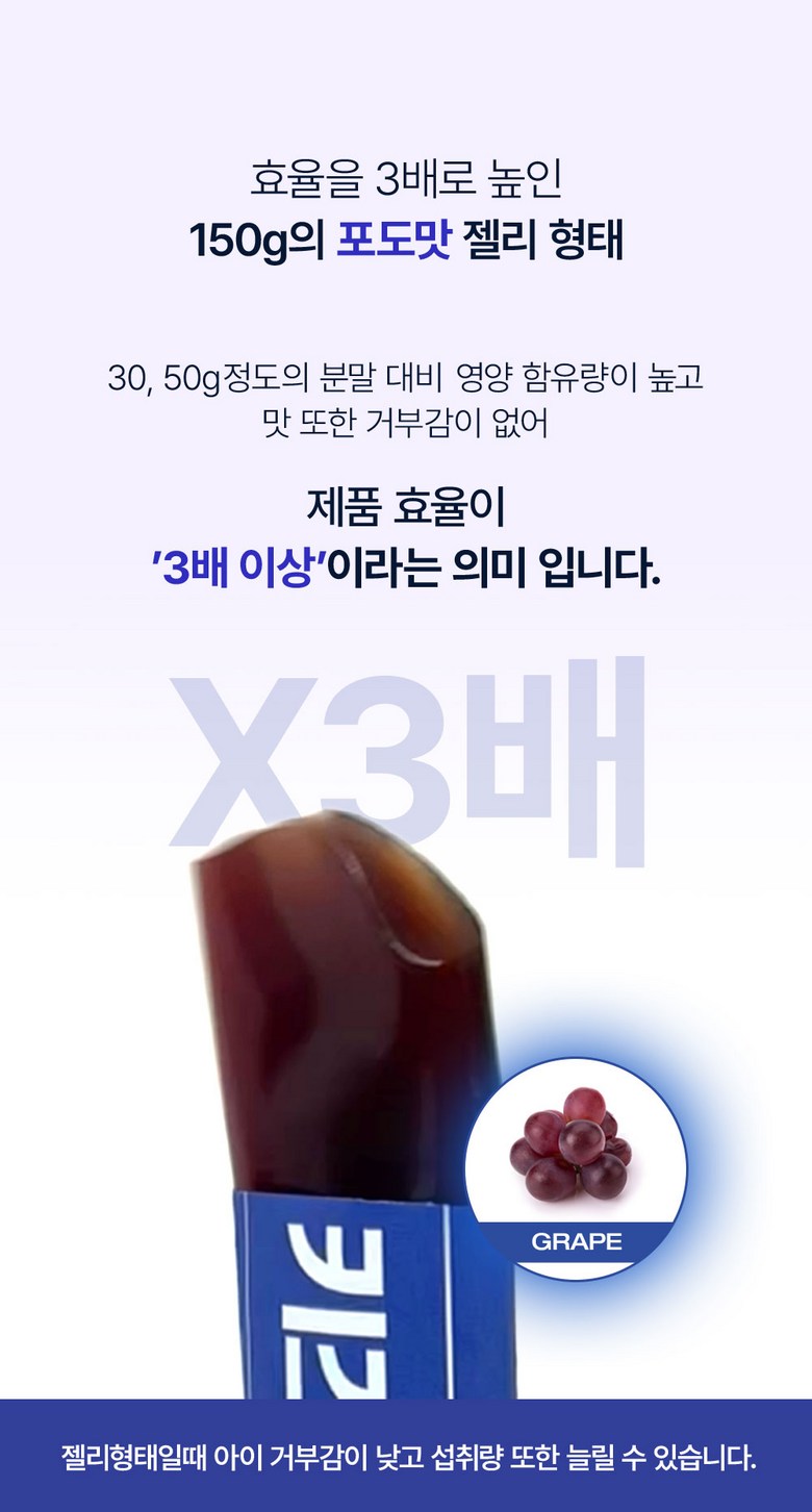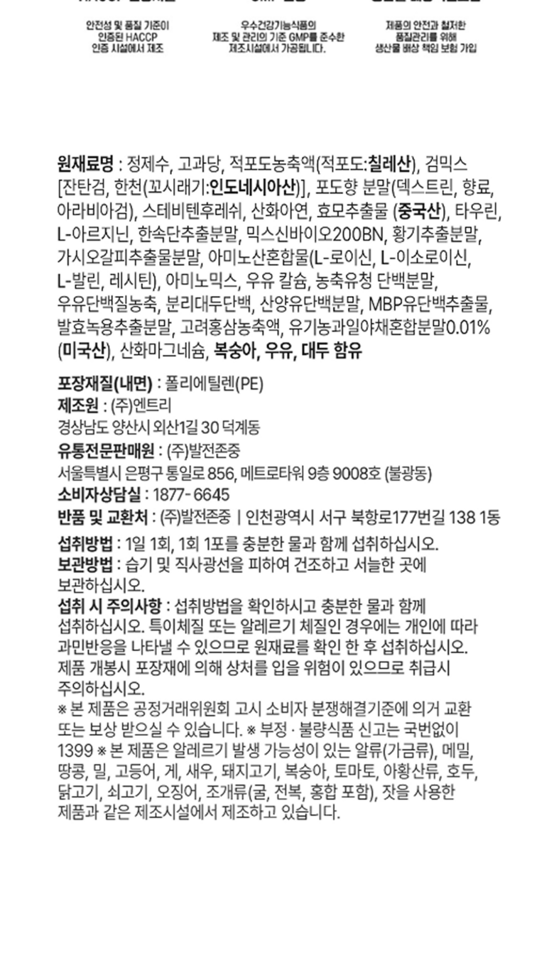 | 포장단위별 내용물의 용량(중량), 수량 | 1박스당 15포(150g) | 원재료명 및 함량 | 정제수, 고과당, 적포도농축액(적포도:칠레산), 검믹스[잔탄검, 한천(꼬시래기:인도네시아산)], 포당 분말(덱스트린, 향료, 아라비아검), 스테비아후레바, 산화아연, 효모추출물(중국산), 타우린, L-아르지닌, 산수유추출분말, 믹스네이오200Bn, 흑마늘분말, 가시오갈피추출분말, 아미노산혼합물(L-로이신, L-이소로이신, L-발린, 레시틴), 아미노믹스, 우유칼슘, 농축유청 단백분말, 유원단백질농축물, 분리대두단백, 산양유단백분말, MBP단백추출물, 발효녹용추출분말, 고려홍삼농축액, 유기농과일야채혼합분말0.01%(미국산), 산화마그네슘, 복숭아, 우유, 대두 함유 |