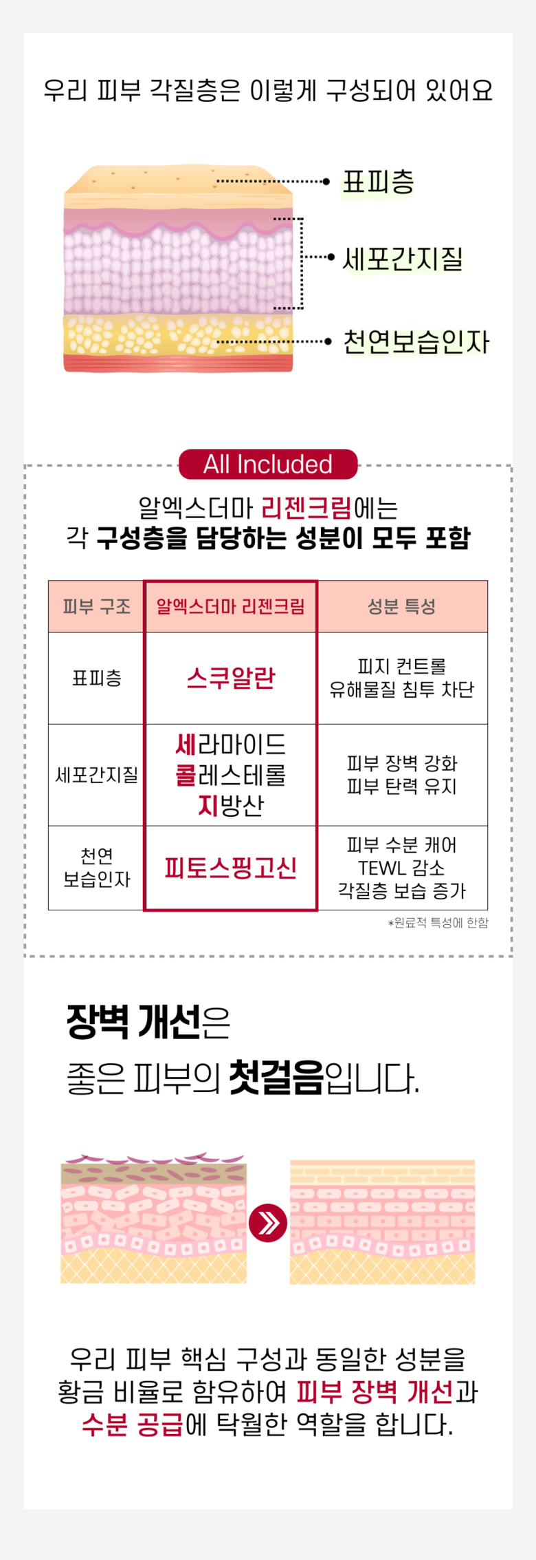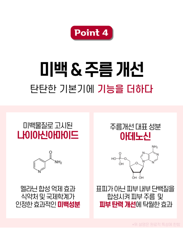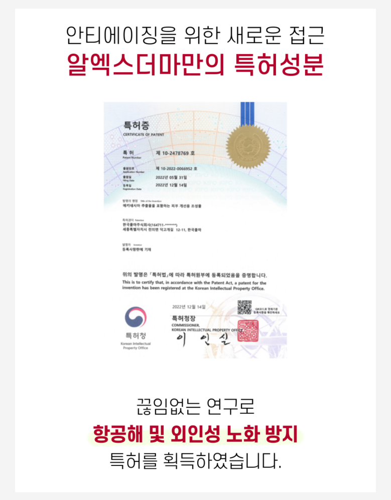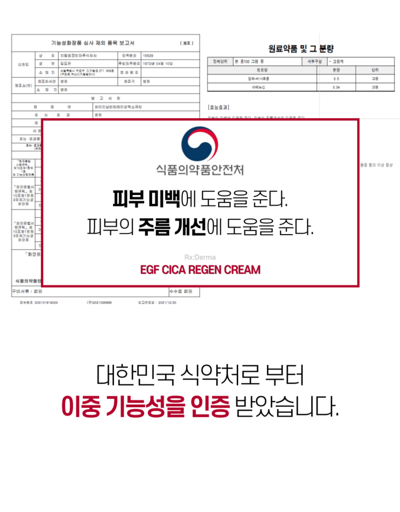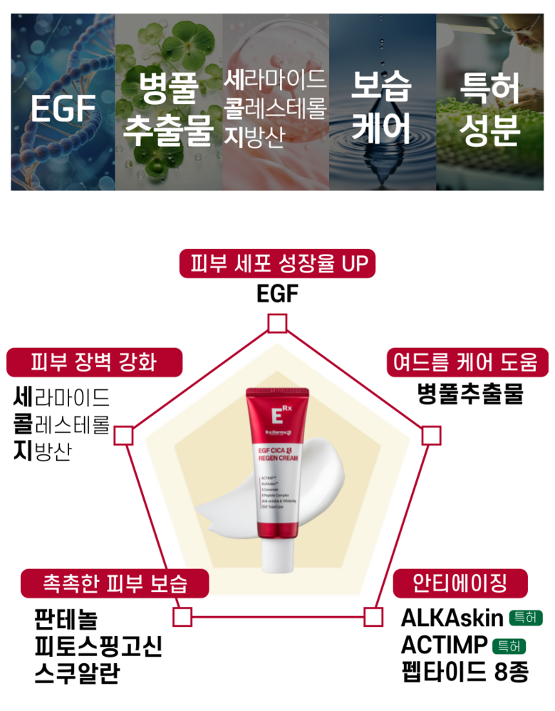 | 용량(중량) | 50ml | 제품 주요 사양 | 모든피부용, ACTIMP 특허, ALKAskin 특허, 5가지 형태의 세라마이드 함유, 8가지 펩타이드, EGF 토탈캐어, 판테놀, 애씨드 컴플렉스, 스ㅡ쿠알란, 병풀추출물, 피토스핑고신, 미백 주름개선 2중 기능성, 피부자극테스트 완료 |