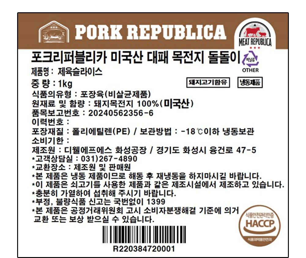 | 제조연월일, 소비기한 또는 품질유지기한 | 소비기한(또는 유통기한) : 2027년 01월 07일 이거나 그 이후인 상품 제조년월일 : 2026년 01월 08일 이후인 제조상품 | 세부 품목군별 표시사항 | 축산물 등급표시 : 해당 없음 / 이력번호 표시유무 : 이력번호 표시제품임 |