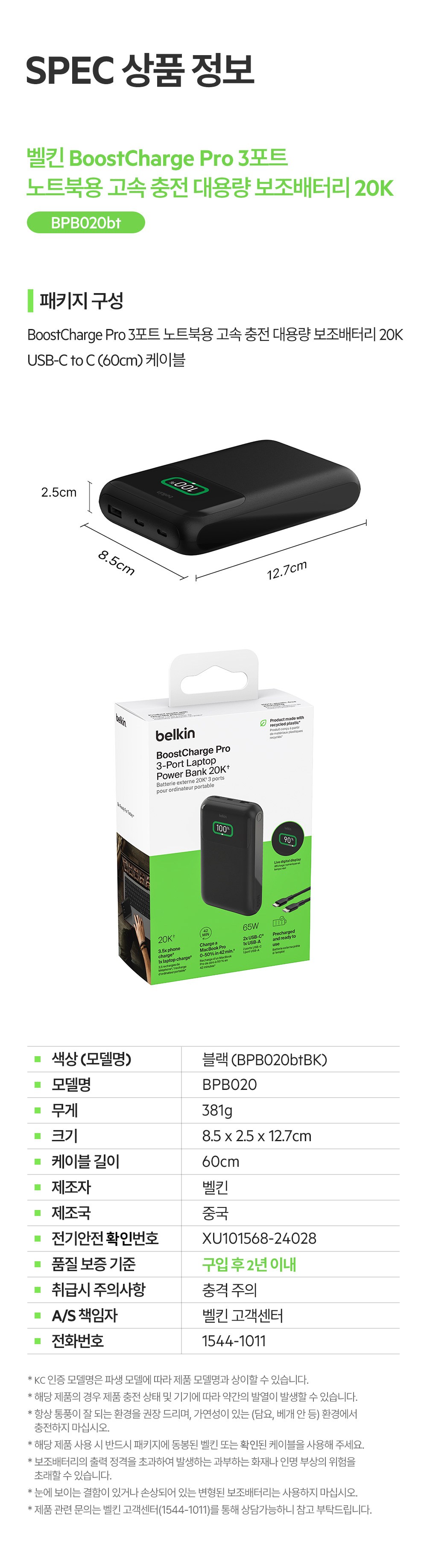 | 품명 및 모델명 | 벨킨 부스트차지 프로 3포트 노트북용 65W 고속 충전 대용량 보조배터리 20K / BPB020btBK (BPB020) | KC 인증정보 | XU101568-24028 |