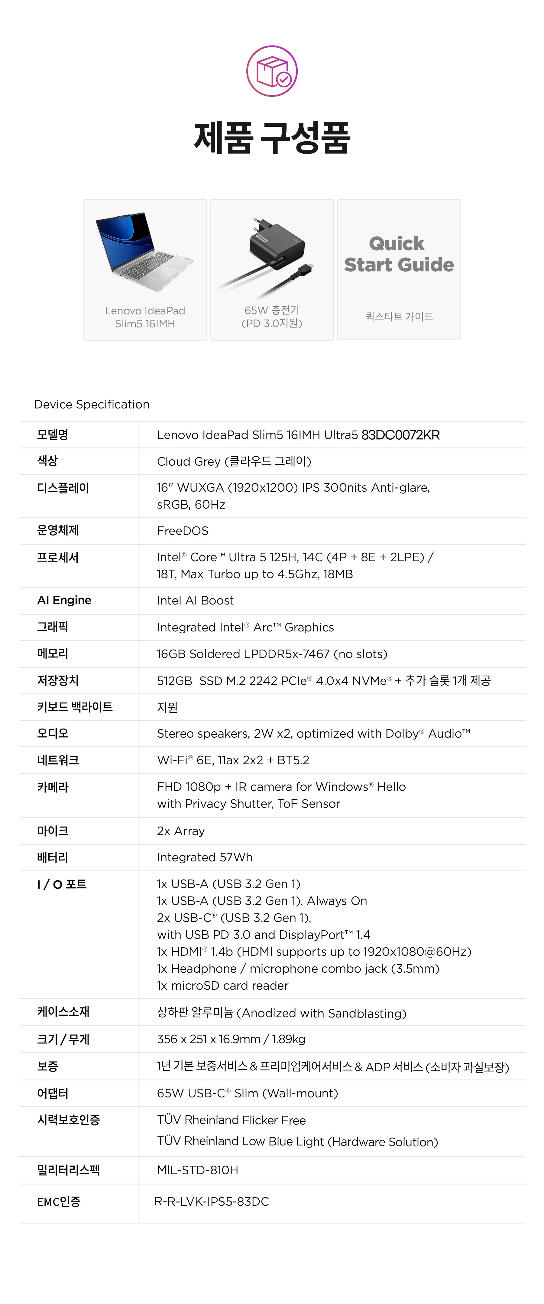 | 품명 및 모델명 | 노트북컴퓨터 / 인증모델명:83DC 모델명: 83DC0072KR | KC 인증정보 | R-R-LVK-IPS5-83DC |