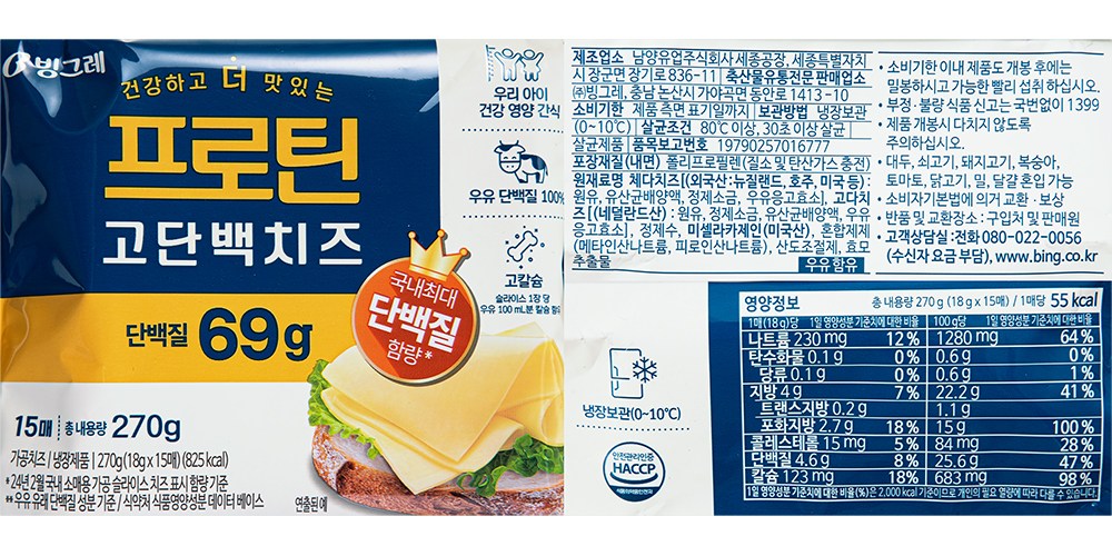 | 제품명 | 빙그레 프로틴 고단백 치즈 | 식품의 유형 | 가공치즈 |
