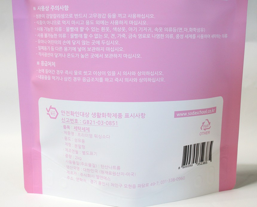 | 품목 및 제품명 | 세탁세제 / 프리미엄 워싱소다 | 용도(표백제의 경우 계열을 함께표시) 및 제형 | 섬유용 / 분말형 |