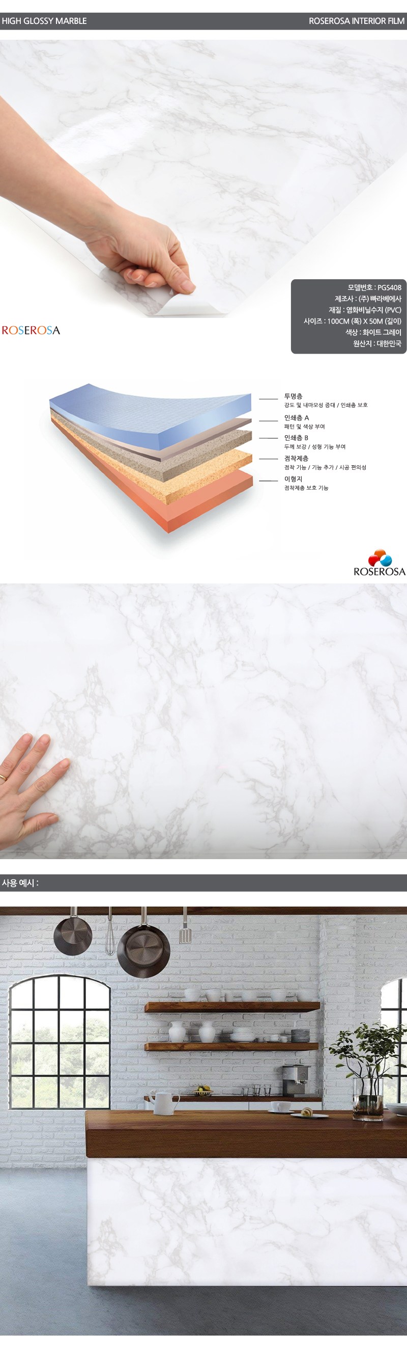 | 품명 및 모델명 | 로즈로사 인테리어필름 매트 마블 유광 대리석 시트지 PGS408 화이트 그레이 100CM X 50M | 인증/허가 사항 | 해당없음 |