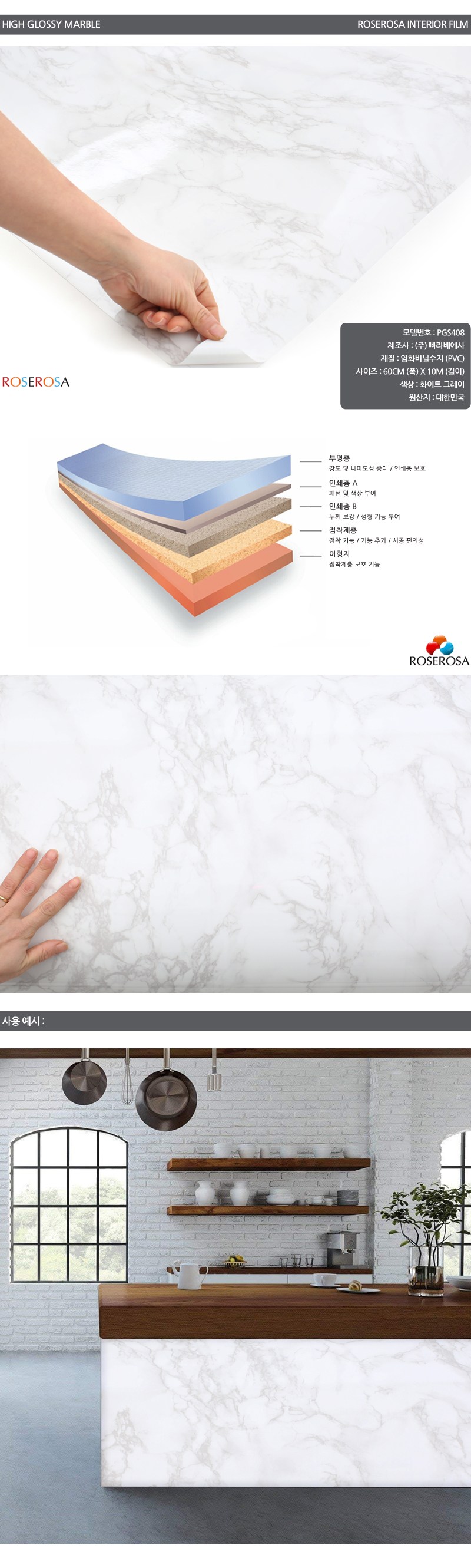| 품명 및 모델명 | 로즈로사 인테리어필름 매트 마블 유광 대리석 시트지 PGS408 화이트 그레이 60CM X 10M | 인증/허가 사항 | 해당없음 |