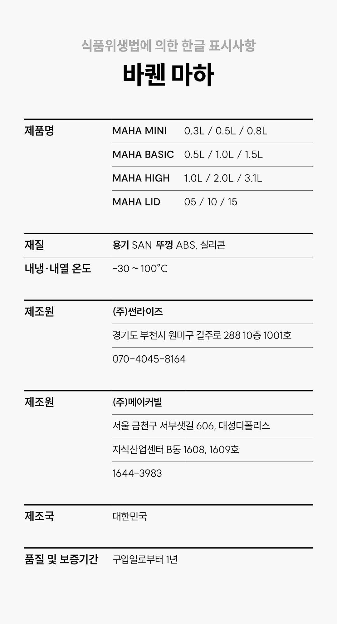 | 품명 및 모델명 | 바퀜 마하 포라 베이직 1.0L | 재질 | 용기 : SAN , 뚜껑 : ABS,실리콘 |