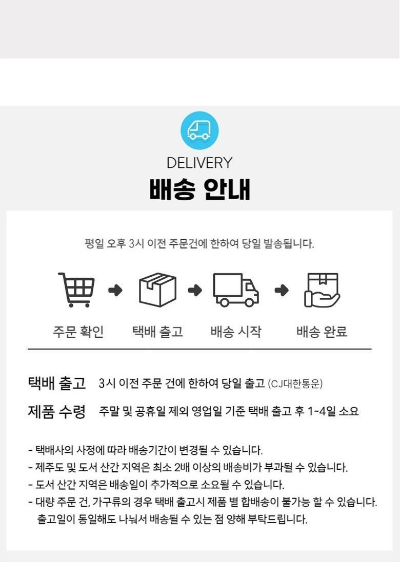 | 배송기간 | ㆍ도서산간 지역 등은 배송에 3-5일이 더 소요될 수 있습니다. - 천재지변, 물량 수급 변동 등 예외적인 사유 발생 시, 다소 지연될 수 있는 점 양해 부탁드립니다. | ||