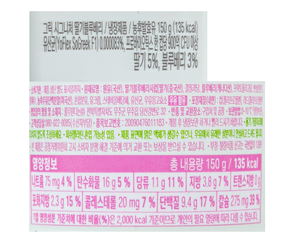 | 제품명 | 그릭 시그니처 딸기블루베리 | 식품의 유형 | 농후발효유 |