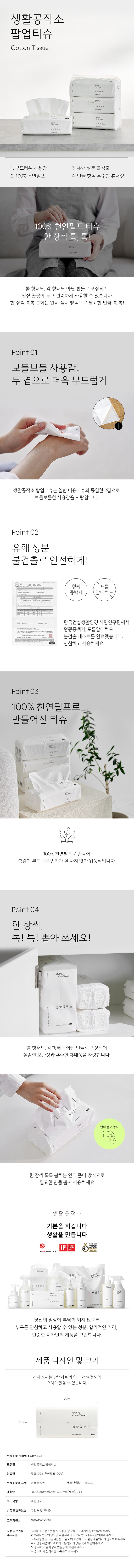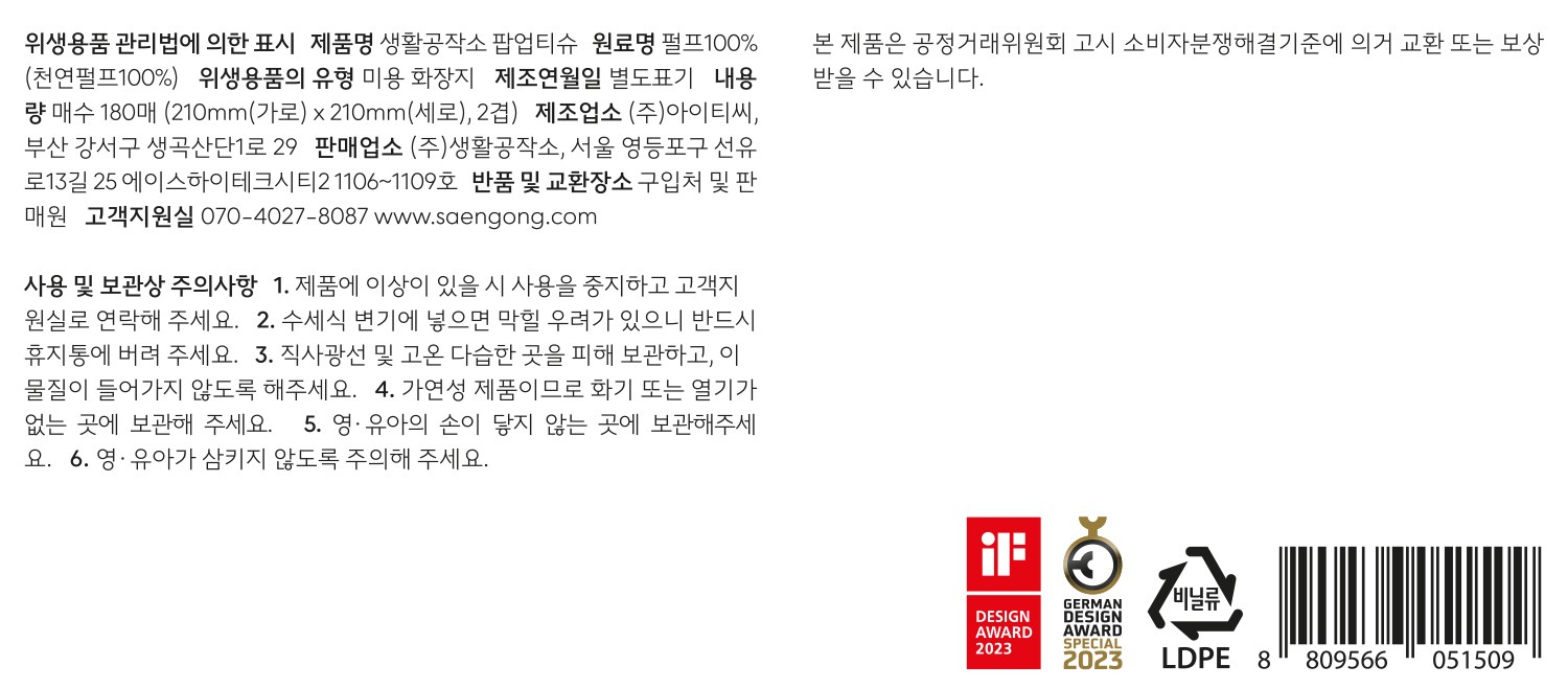 | 품명 및 모델명 | 생활공작소 팝업티슈 | 인증/허가 사항 | 위생용품 |