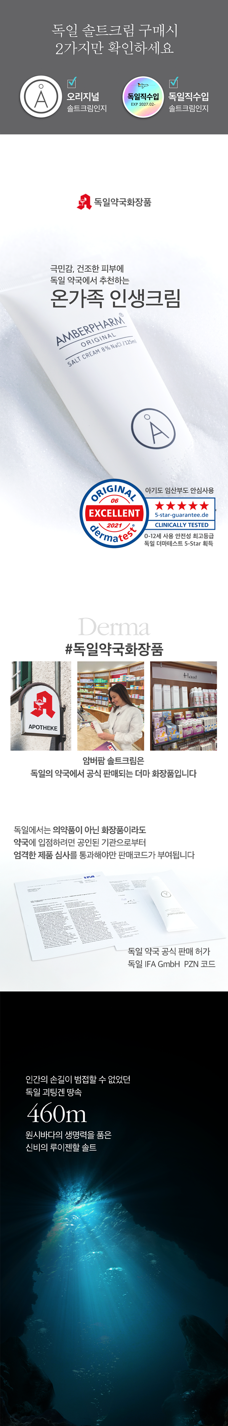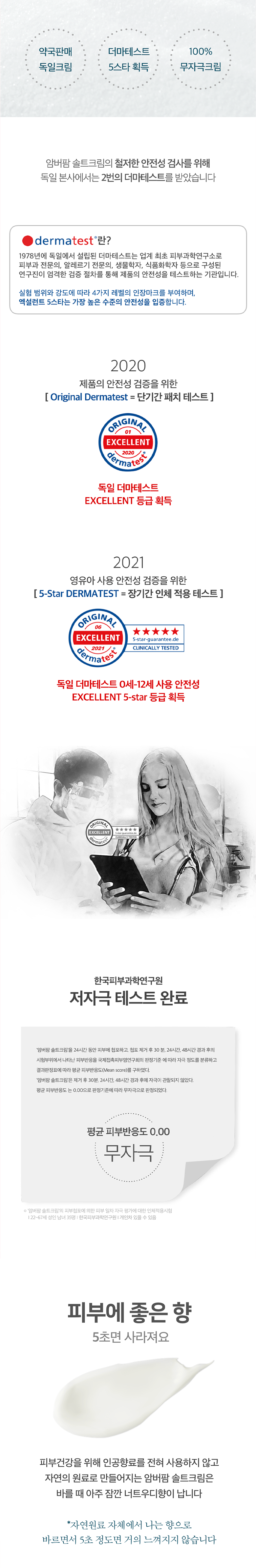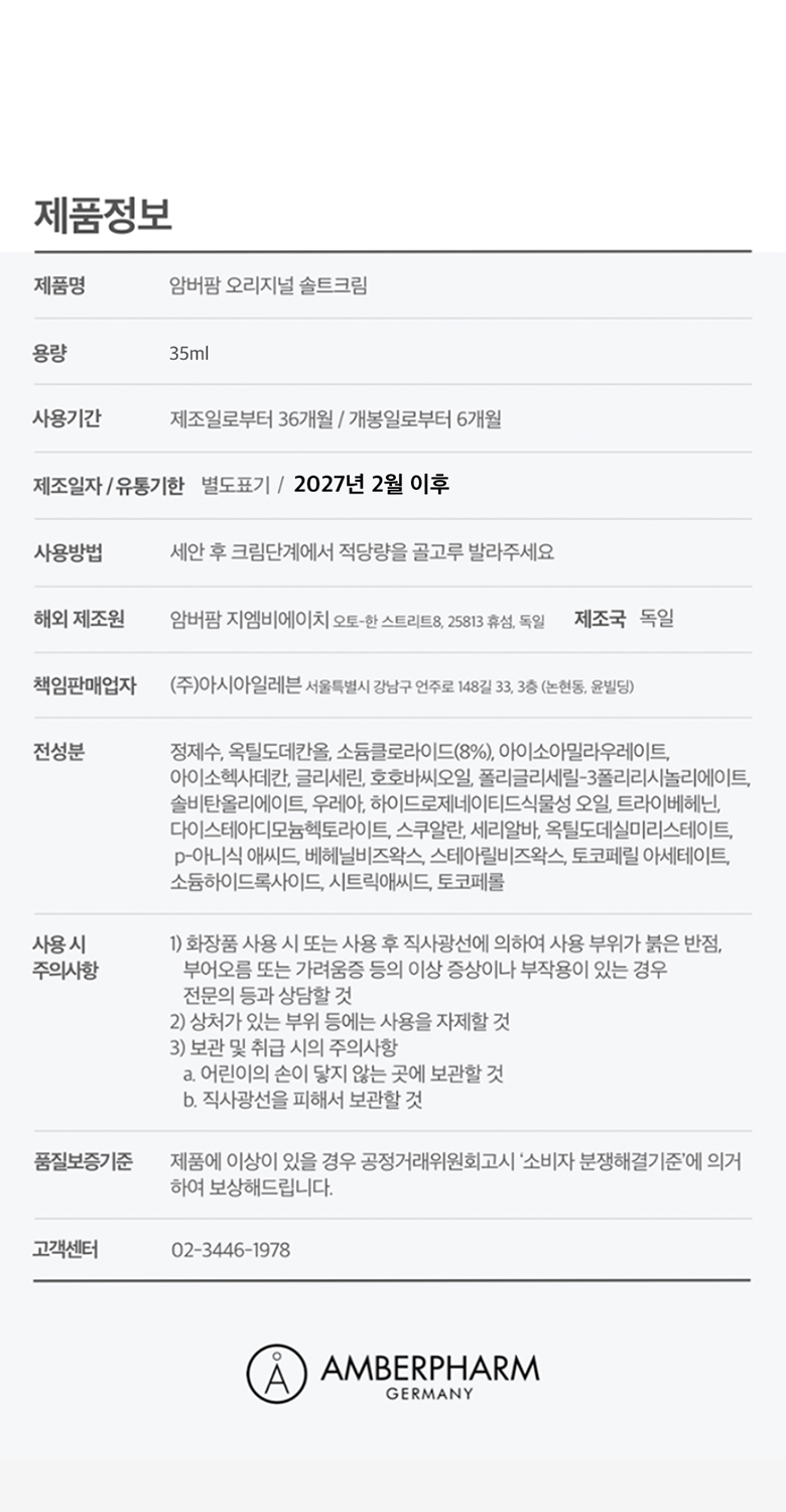 | 용량(중량) | 35ml | 제품 주요 사양 | 약산성 보습 솔트크림, 유해한 성분배제, 영유아 안전성 더마테스트 최고등급으로 모두가 안심하고 사용가능한 온가족 크림 , 100시간 수분홀딩, 건조에의한 가려움 완화 |