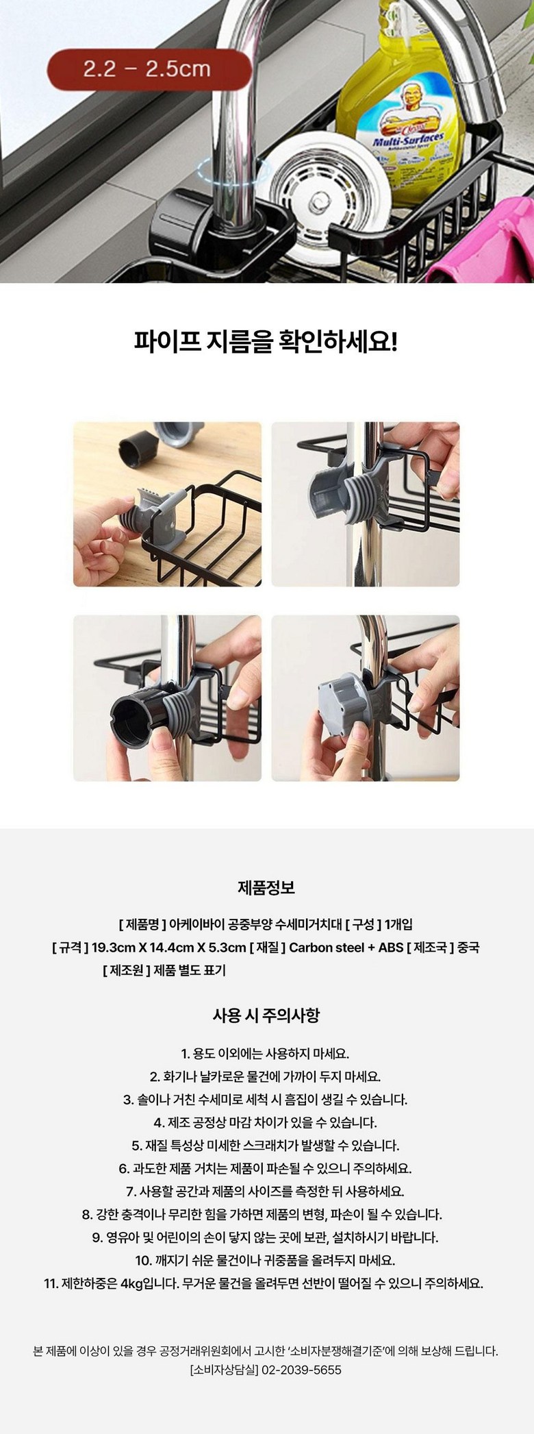 상품 사용 가능한 수전 지름은 2.2~2.5cm 입니다. 수전 사이즈 확인 후 주문 부탁드립니다.
