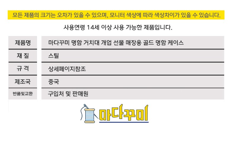 | 품명 및 모델명 | 마다꾸미 명함 거치대 개업 선물 매장용 골드 명함 케이스 03. 블랙 2개 | 인증/허가 사항 | 해당없음(14세이상) |