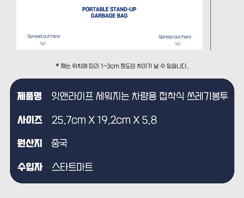 | 품명 및 모델명 | 잇앤라이프 세워지는 차량용 부착 쓰레기봉투 | 인증/허가 사항 | 해당사항없음 |