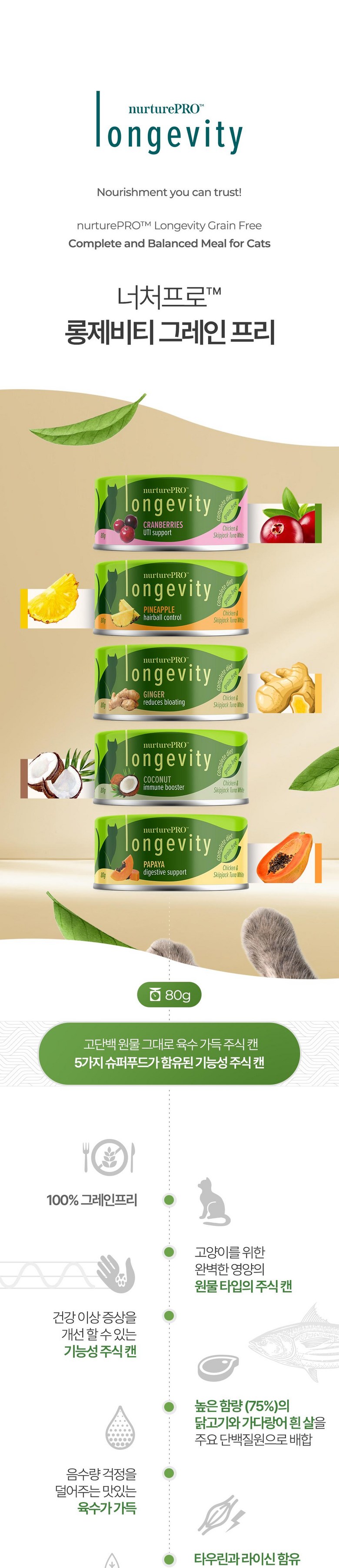너처프로 전연령용 고양이 롱제비티 그레인 프리 주식캔 파파야와 녹차