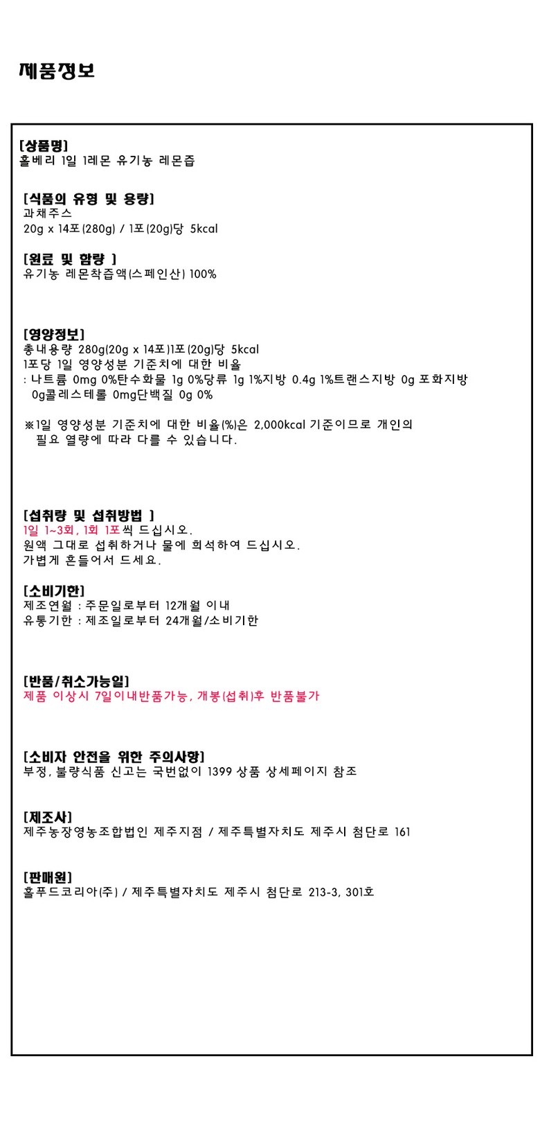 - 유기농/친환경 등: 스페인산 유기농레몬 100% NFC착즙
