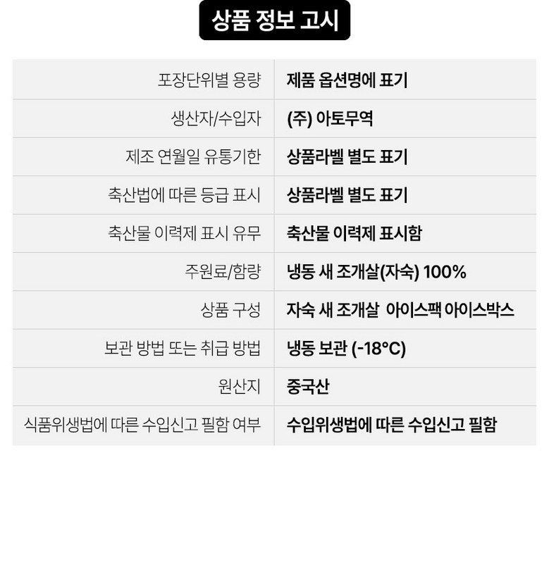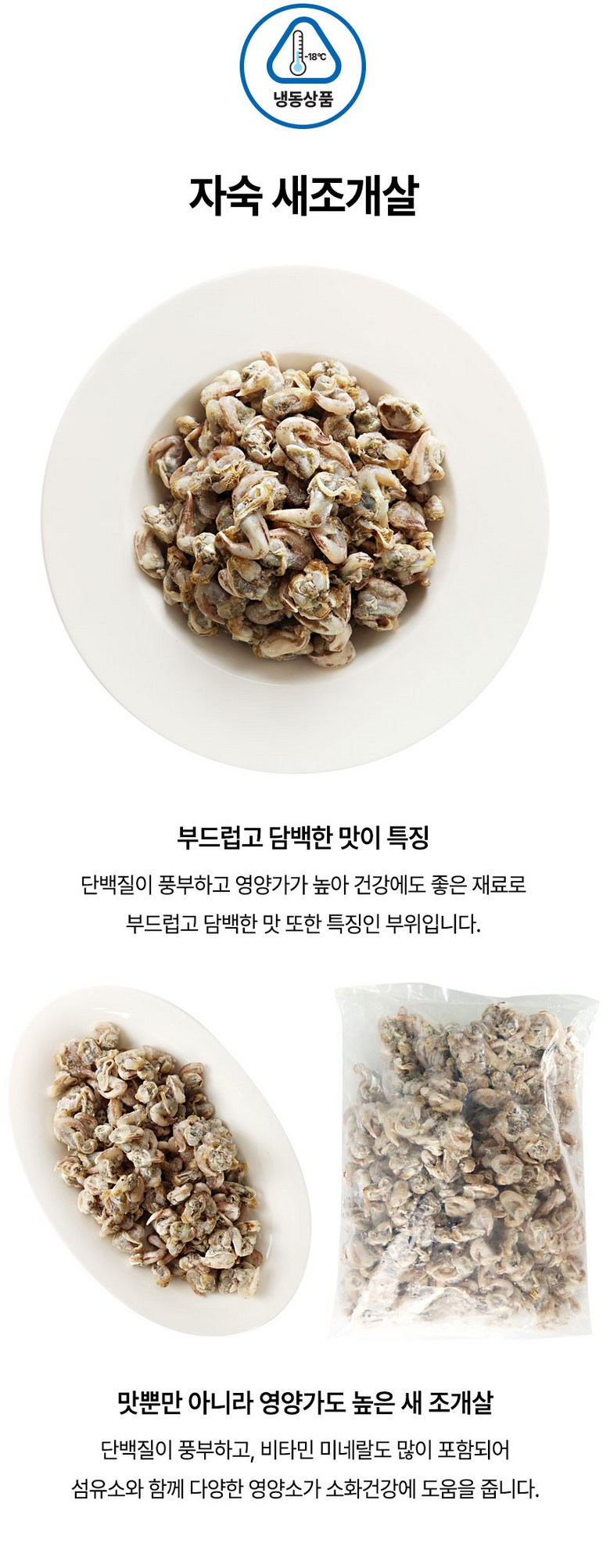 | 품목 또는 명칭 | 자숙 새조개살 | 포장단위별 내용물의 용량(중량),수량,크기 | 상품 상세페이지 참조 |