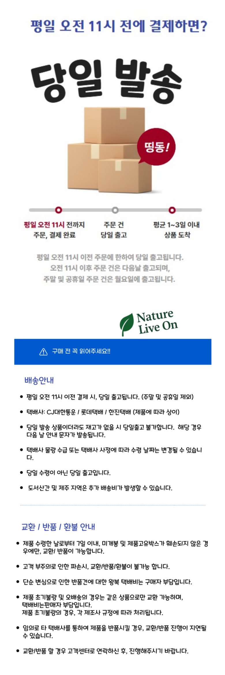 | 배송기간 | ㆍ도서산간 지역 등은 배송에 3-5일이 더 소요될 수 있습니다. - 천재지변, 물량 수급 변동 등 예외적인 사유 발생 시, 다소 지연될 수 있는 점 양해 부탁드립니다. | ||