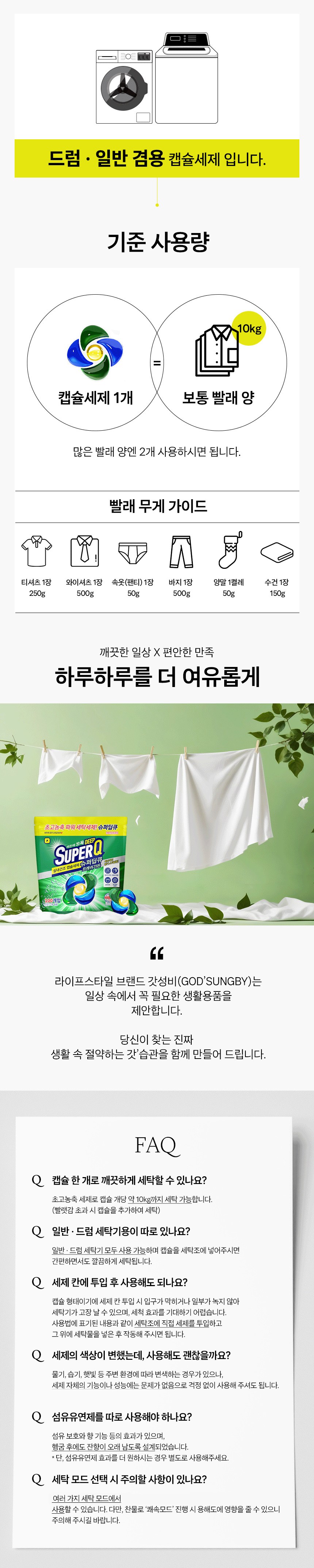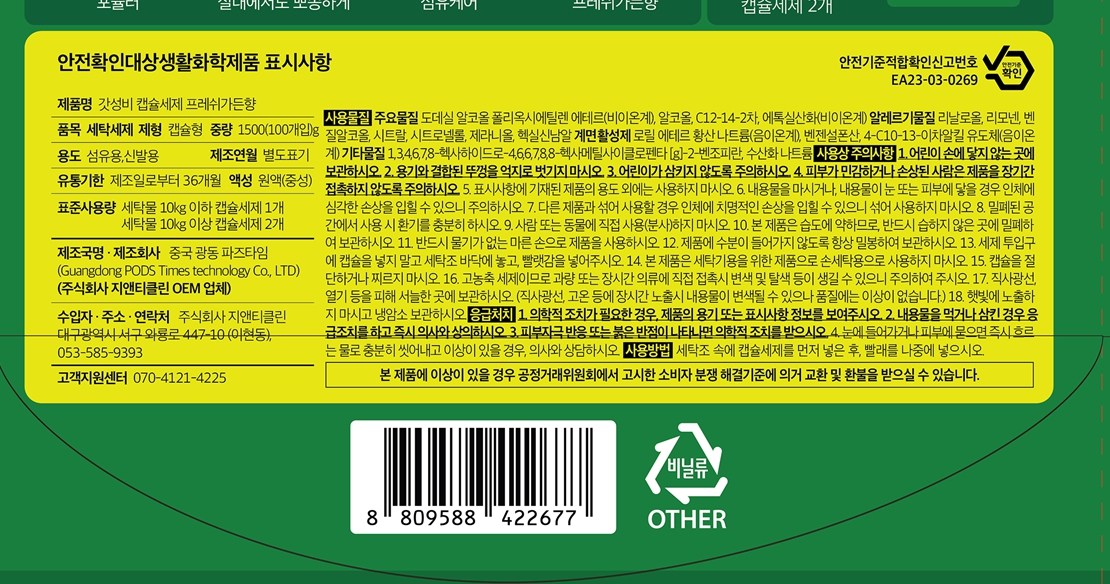 | 품목 및 제품명 | 세탁세제 / 갓성비 캡슐세제 프레쉬가든향 | 용도(표백제의 경우 계열을 함께표시) 및 제형 | 섬유용,신발용 / 캡슐형 |