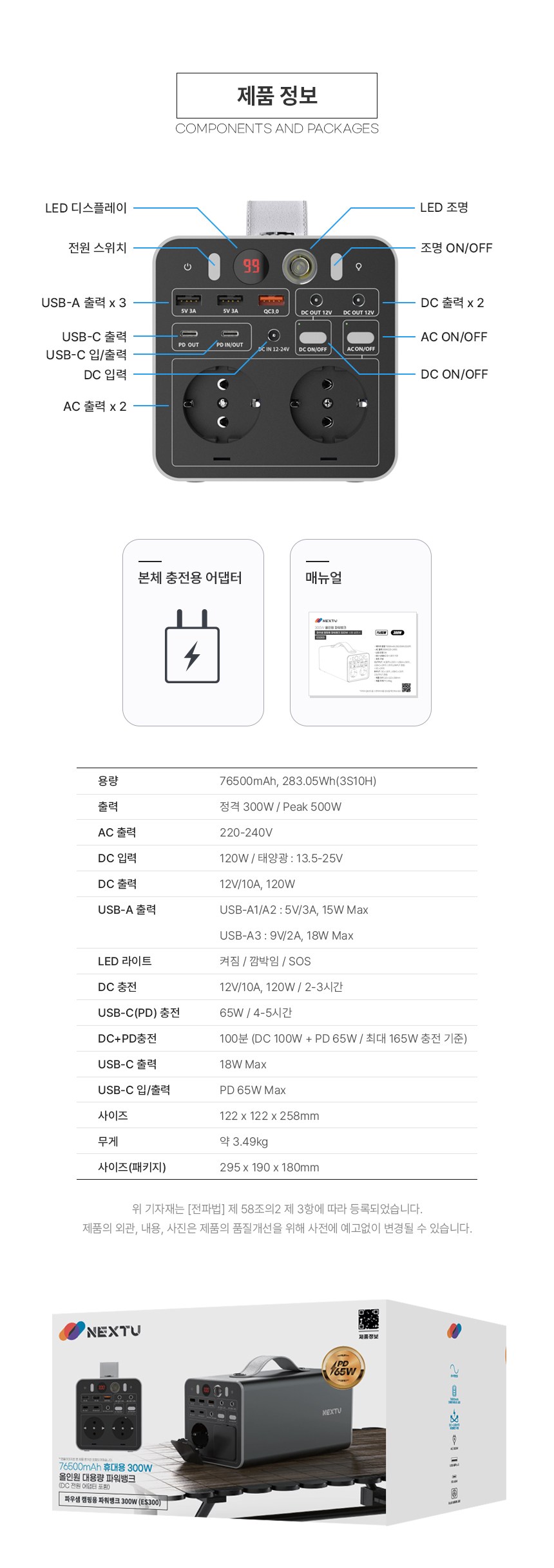 | 품명 및 모델명 | Portable POWER BANK 300W / ES300 | KC 인증정보 | 본품:R-R-NXT-ES300 전지:YU102141-24001,어댑터:R-R-Adt-ATM120T-P240,SU10454-23012 |
