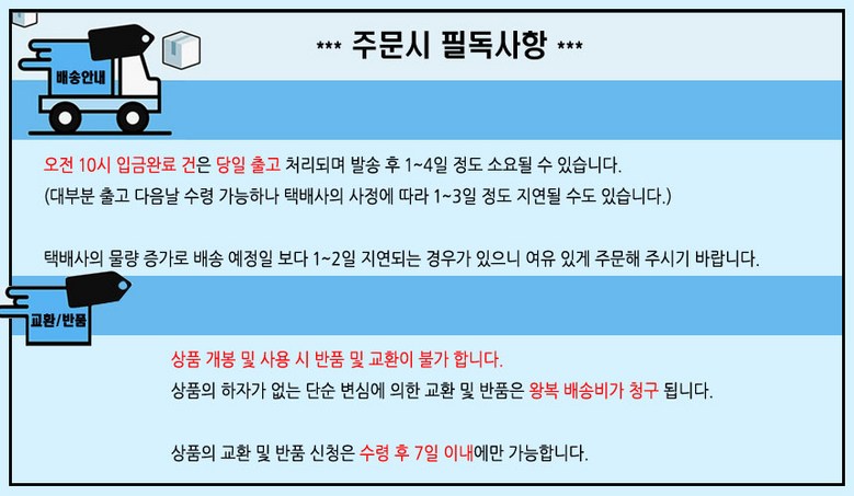 - ㆍ교환/반품에 관한 일반적인 사항은 판매자가 제시사항보다 관계법령이 우선합니다.