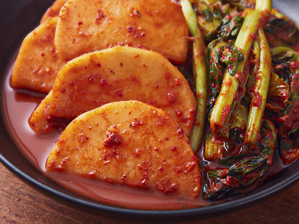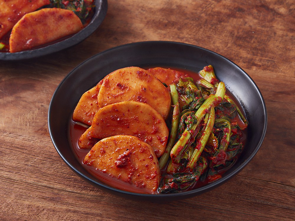 큼직하게 썰어낸 석박지는 깍두기와는 또 다른 매력을 뽐내죠. 한 입에 먹기 어려운 크기지만, 오히려 그 덕에 크게 한입 베어 무는 재미를 느낄 수 있는데요. 아삭아삭한 석박지와, 개운한 맛이 돋보이는 갓을 함께 즐겨보세요. 매콤하면서 시원한 맛이 좋아 뜨끈한 국물 요리와 잘 어울려요.