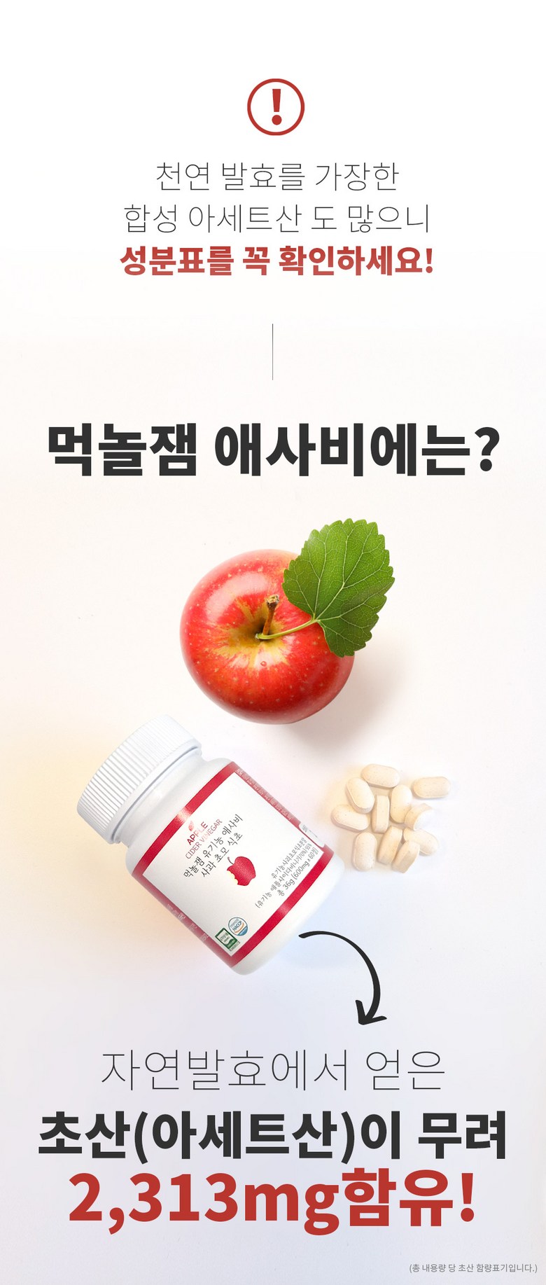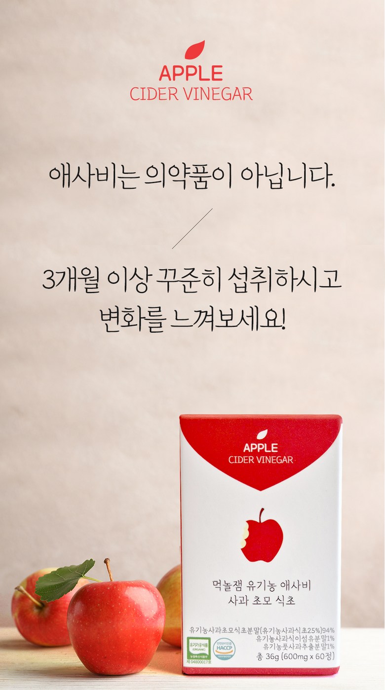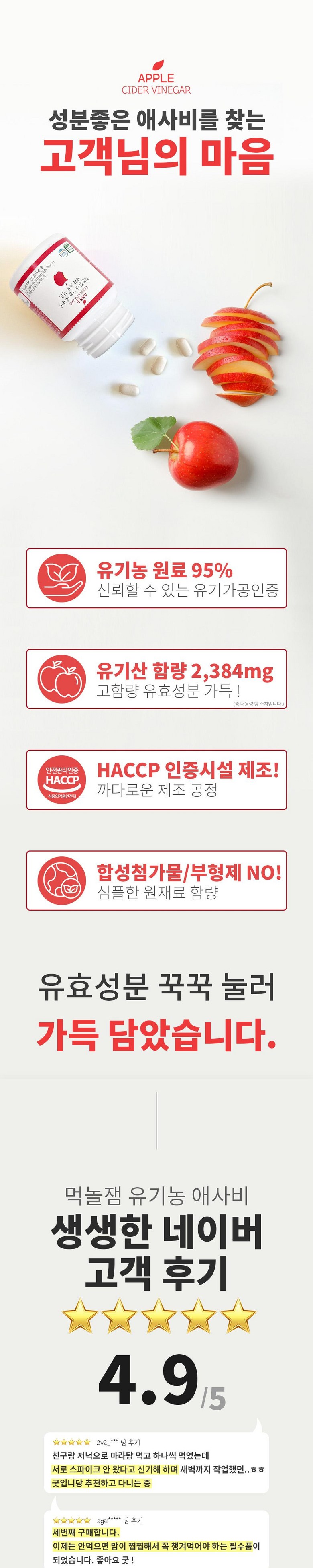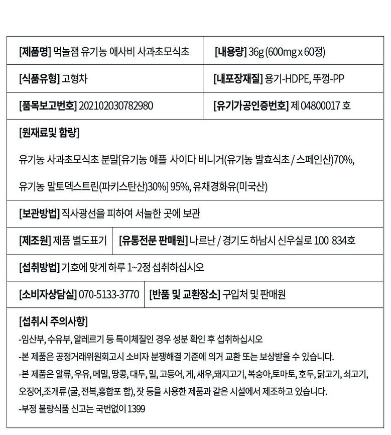 | 제품명 | 먹놀잼 유기농 애사비 사과초모식초 | 식품의 유형 | 고형차 |