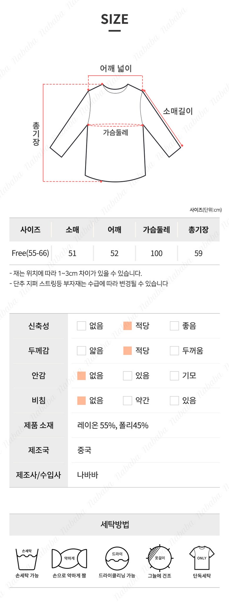 | 제품 소재 | 레이온 55%, 폴리 45% | 색상 | 상품 상세페이지 참조 |