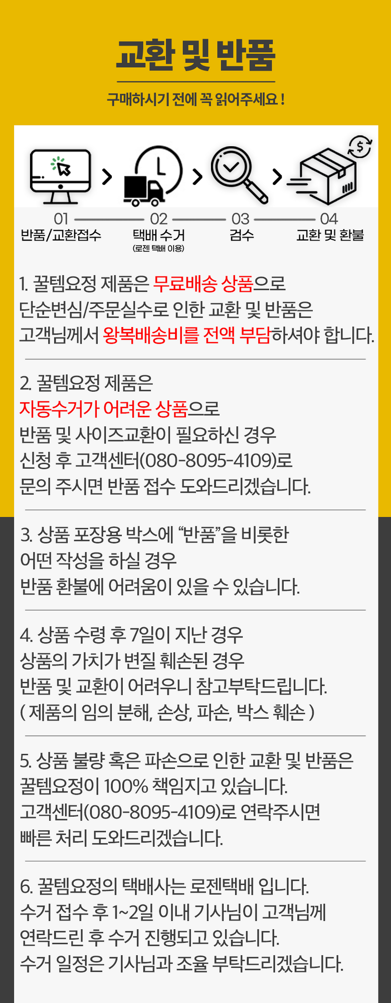 - ㆍ모니터 해상도의 차이로 인해 색상이나 이미지가 실제와 달라, 고객이 단순 변심으로 교환/반품을 무료로 요청하는 경우