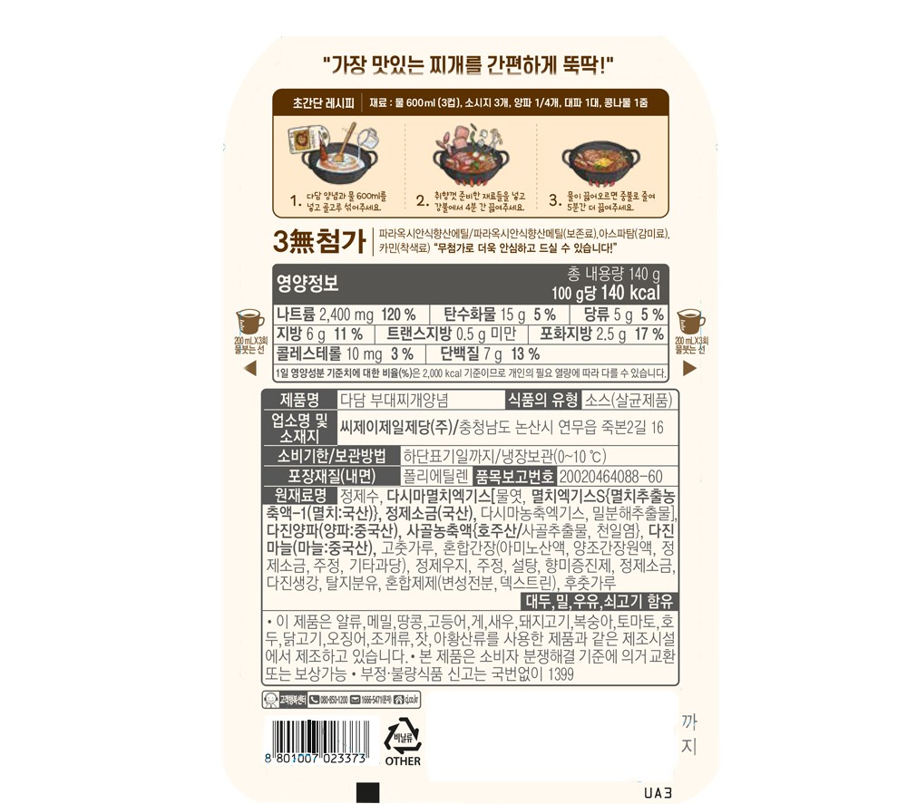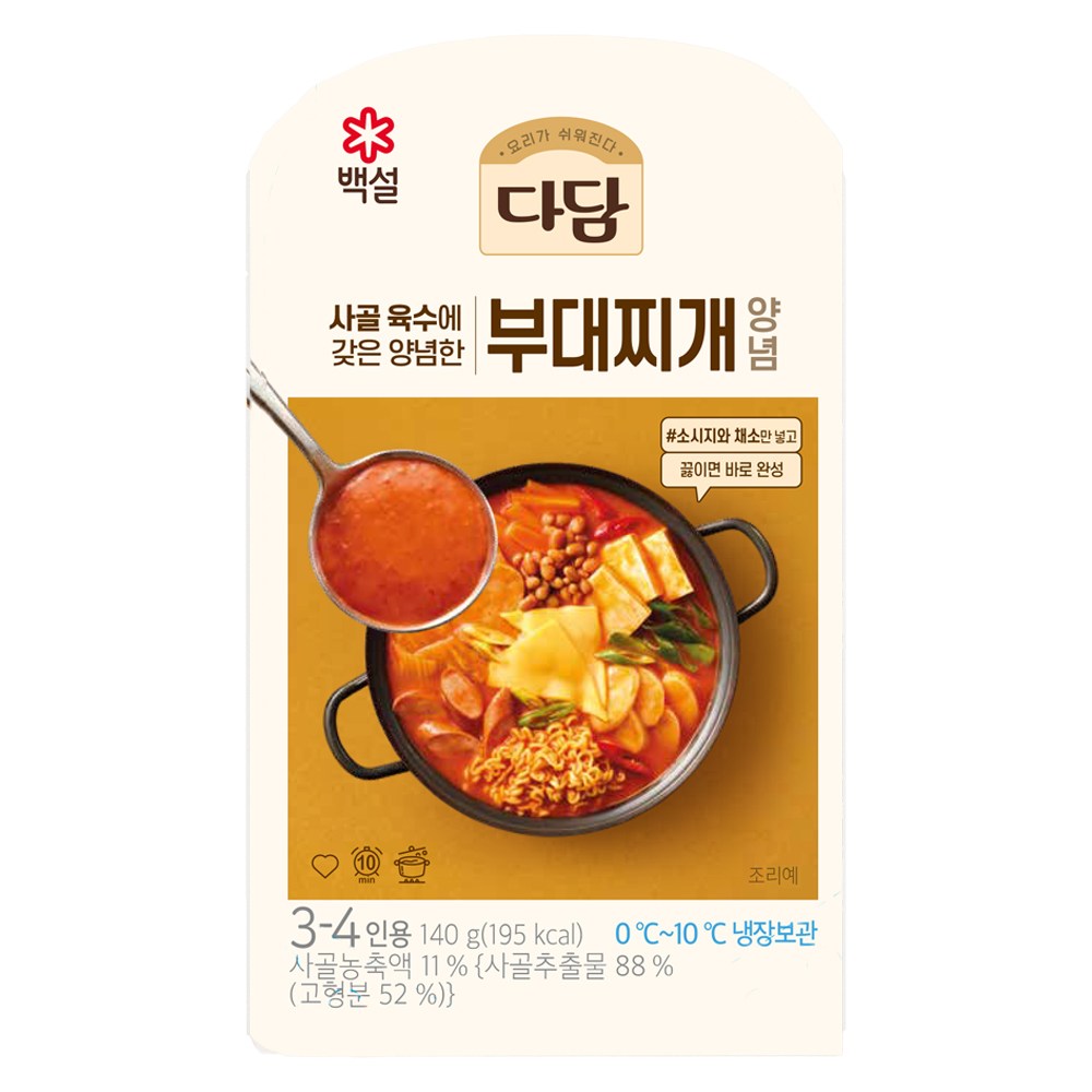 칼칼한 풍미를 자랑하는 부대찌개 양념이에요. 직접 간을 맞출 필요가 없어 간편하죠. 맛이 진하고 깊어, 전문점 못지않은 풍미를 자아내는데요. 햄, 소시지, 김치 등 원하는 재료를 준비해 팔팔 끓여보세요. 입맛 돋우는 부대찌개가 완성된답니다.