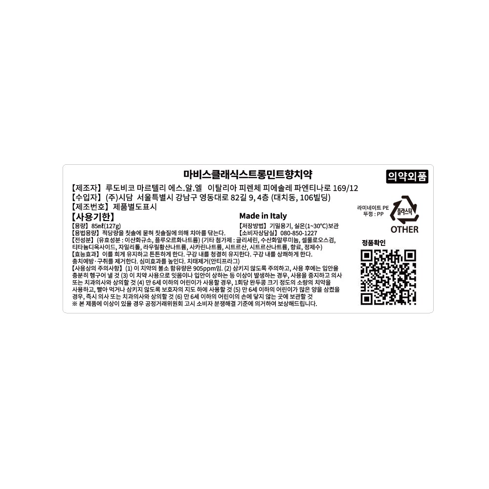 | 품명 및 모델명 | 마비스클래식스트롱민트향치약 | 인증/허가 사항 | 의약외품 |