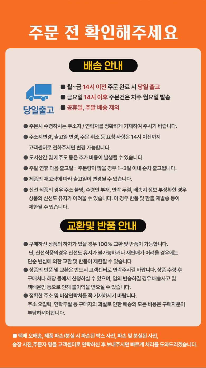 - ㆍ모니터 해상도의 차이로 인해 색상이나 이미지가 실제와 달라, 고객이 단순 변심으로 교환/반품을 무료로 요청하는 경우