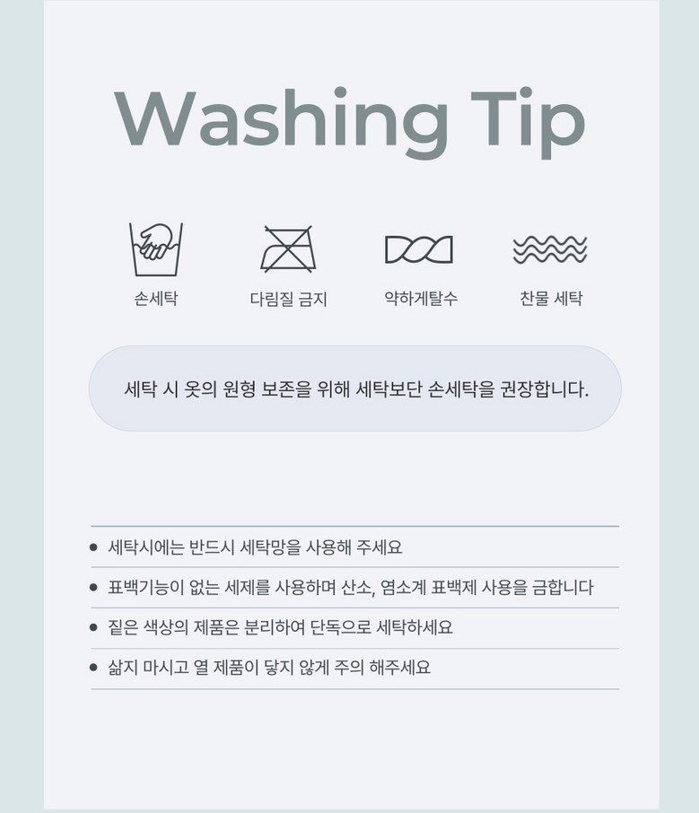 | 제조국 | 중국 | 세탁방법 및 취급시 주의사항 | 손세탁 권장 / 세탁망 사용 권장 |