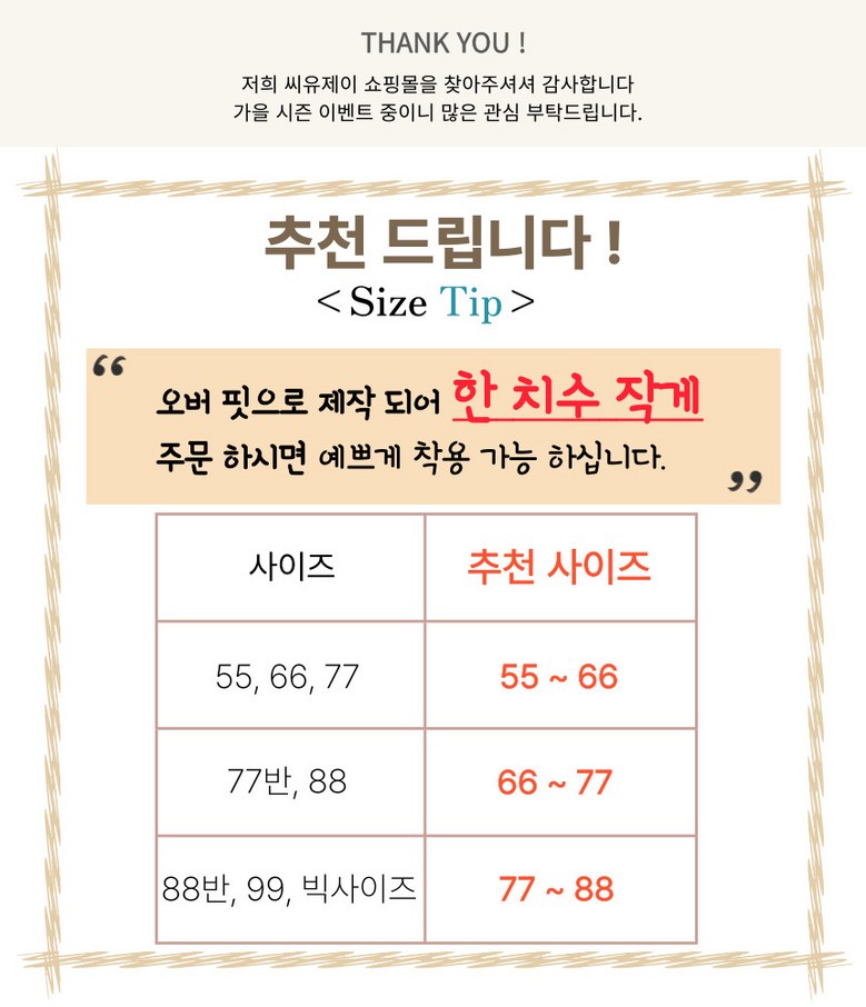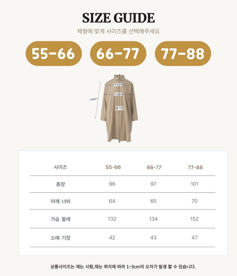 | 치수 | 55~66,66~77,77~88 | 제조자(수입자) | 씨유제이 |