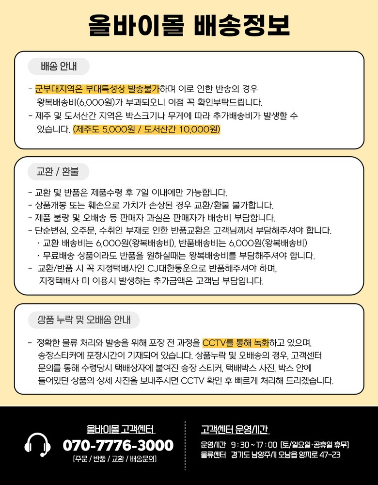 | 교환/반품 비용 (왕복비용) | 6,000원 - 단, 고객 변심의 경우에만 발생 - 도서산간 및 일부 지역 추가비용 발생 |