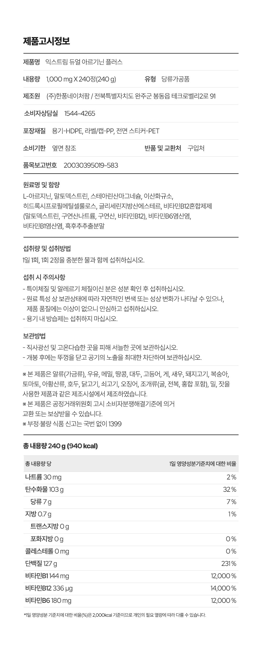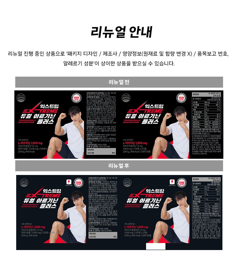 | 제품명 | 익스트림 듀얼 아르기닌 플러스 | 식품의 유형 | 컨텐츠 참조 |