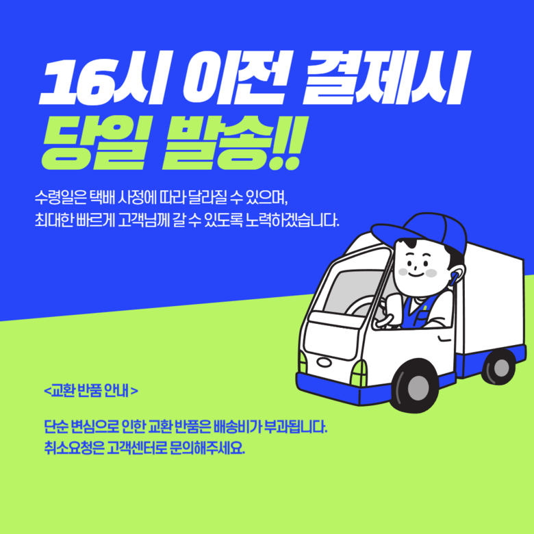 - ㆍ모니터 해상도의 차이로 인해 색상이나 이미지가 실제와 달라, 고객이 단순 변심으로 교환/반품을 무료로 요청하는 경우