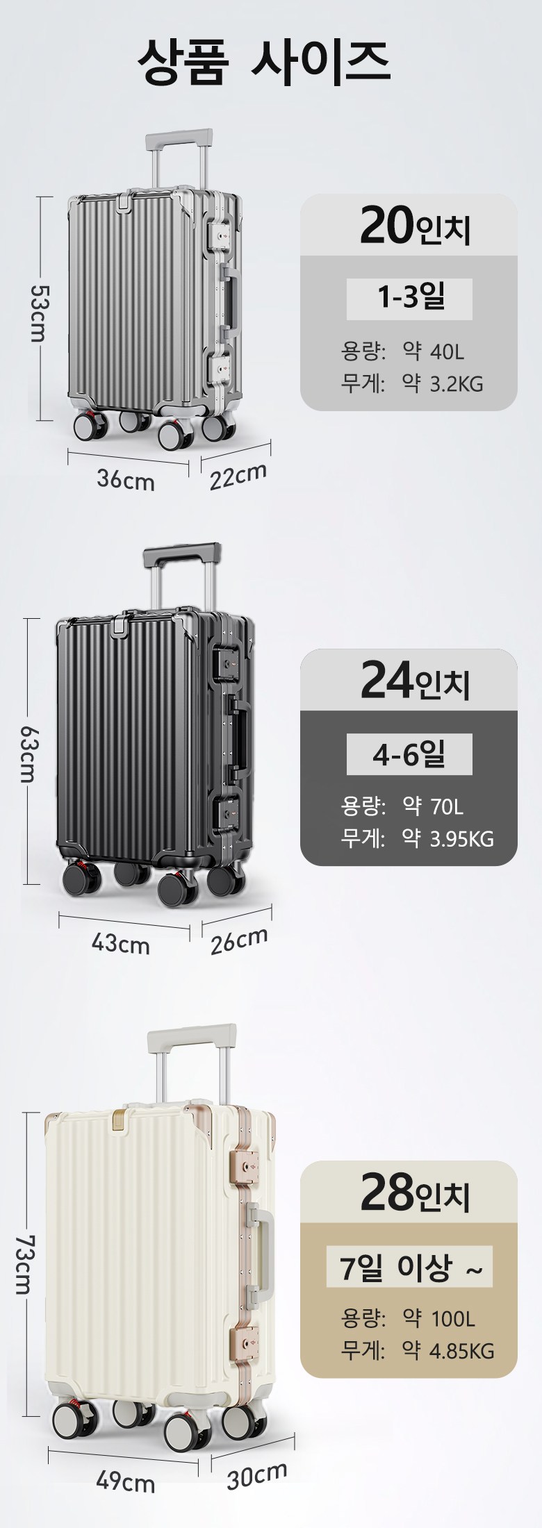 | 치수 | 20형(36x21.5x56.5cm) 24형(42.5x25.5x65.5cm) 28형(49x30x75.4cm) | 제조자(수입자) | 레이청홍콩유한회사 |