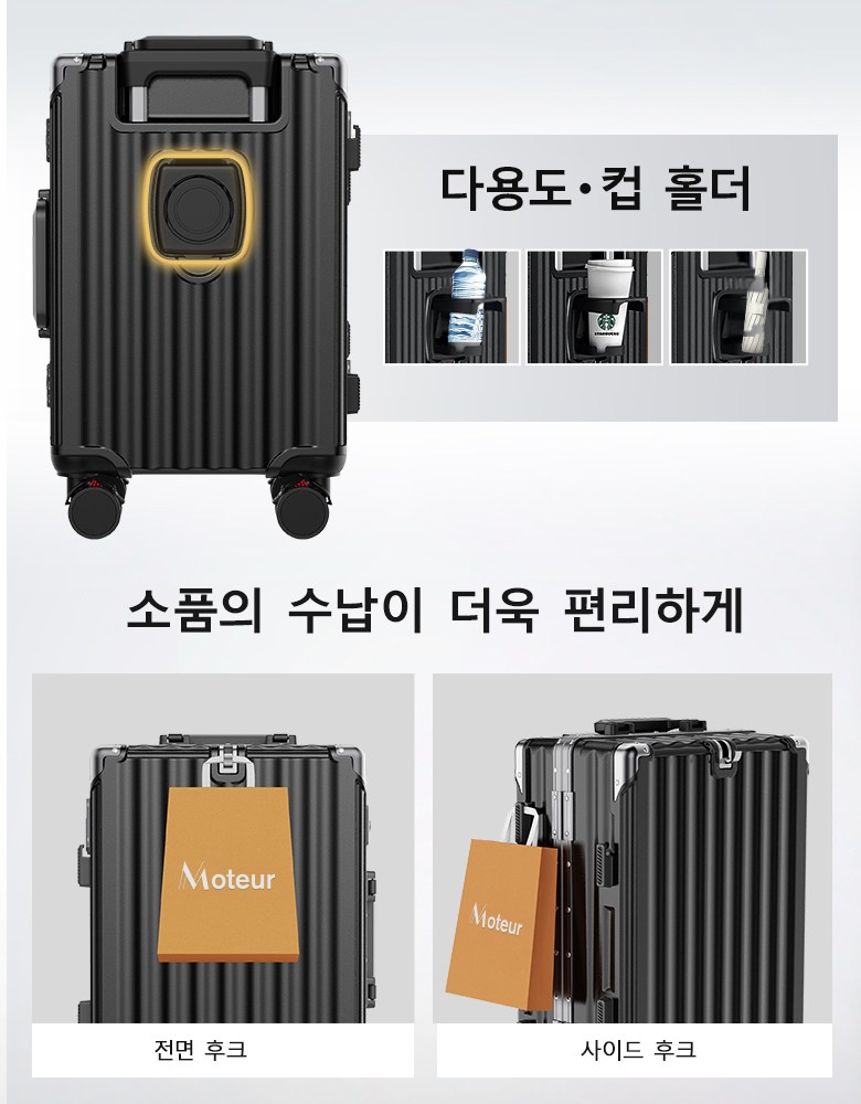 Moteur 기내형 알루미늄 프레임 캐리어 컵 홀더 USB 포트 제공 PC 하드 쉘 스피너 휠 여행 가방 20/24/28인치 중대형 캐리어