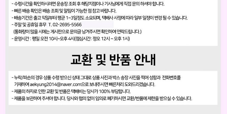 - ㆍ모니터 해상도의 차이로 인해 색상이나 이미지가 실제와 달라, 고객이 단순 변심으로 교환/반품을 무료로 요청하는 경우