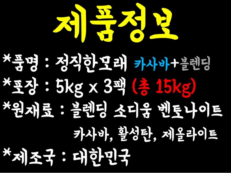 | 품명 및 모델명 | 카사바 블렌딩 혼합모래 15kg | 인증/허가 사항 | 해당사항 없음 |