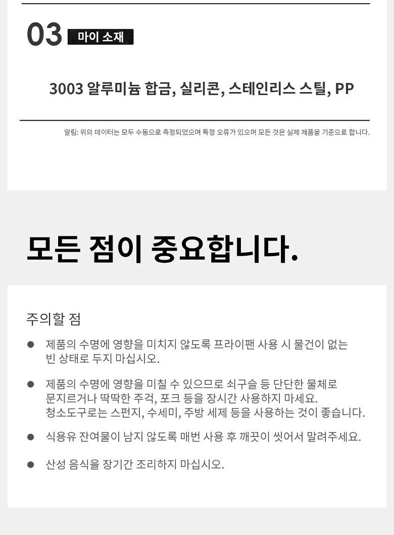 | 크기, 중량 | 주전자 13x13x8cm + 8인치 팬 20.5x20.5x5cm + 1.7L 냄비 17.5x17.5x8.5cm + 3L 냄비 19.5x19.5x11.5cm, 약 1.15kg | 색상 | 블랙 |